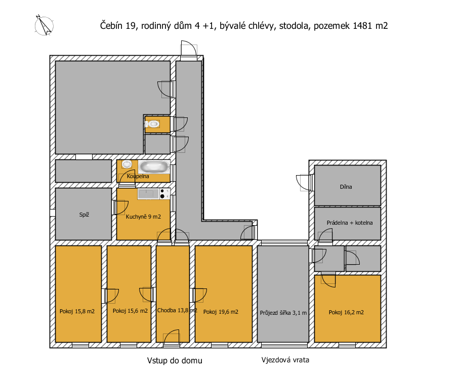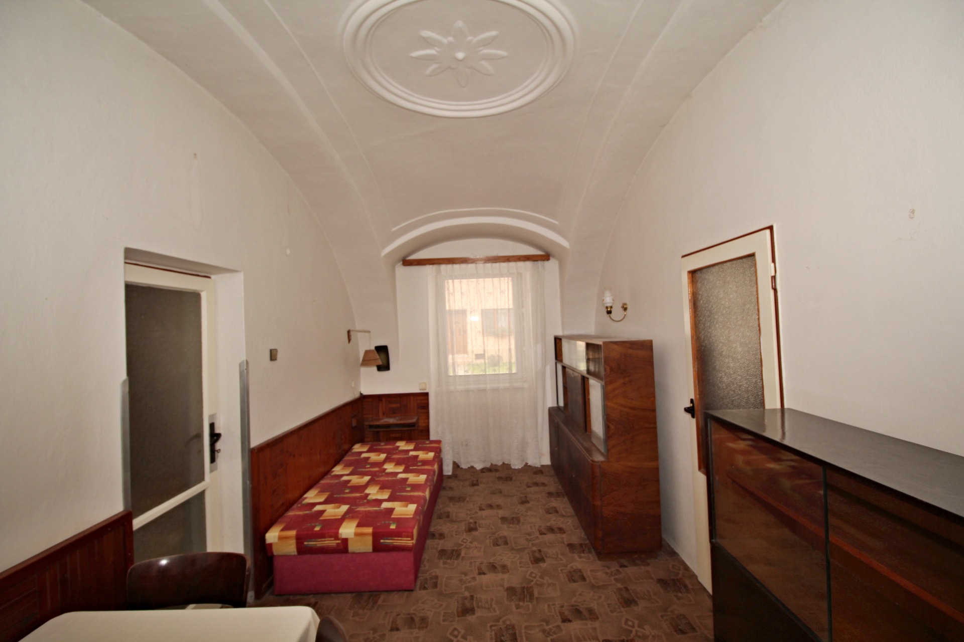 Vstup do domu - 1.NP: chodba, 3 pokoje, kuchyně, spíž, sociální zařízení. Za průjezdem z ulice na dvůr je ještě jeden pokoj, původní kotelna a prádelna s plynovým kotlem.